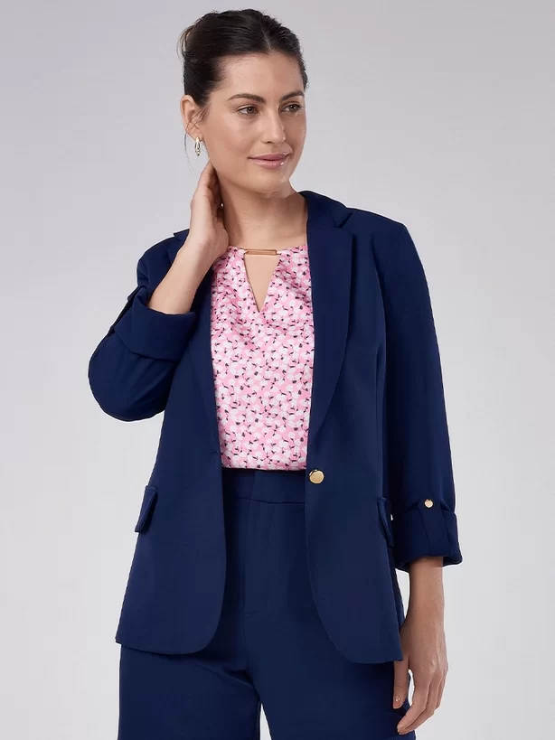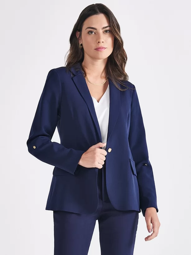 O Blazer é uma peça clássica atemporal e versátil que você precisa ter no seu guarda-roupa. Confeccionado em tecido plano de alfaiataria na cor azul marinho, ele possui pences abaixo do busto que o acinturam, seu comprimento é alinhado ao quadril e as mangas são de duas folhas, seu diferencial fica por conta do martingale nas mangas, que pode ser dobrada. Com gola blazer tradicional, a peça proporciona um shape alinhado e empoderado. Seu forro interno é de cetim e proporciona toque sedoso, tornando a peça muito confortável. Além disso, possui ombreiras e feltros que dão estrutura à peça. Nas costas, conta com recorte princesa que favorece o efeito acinturado, além do mais, na gola é aplicada placa de metal dourada personalizada.